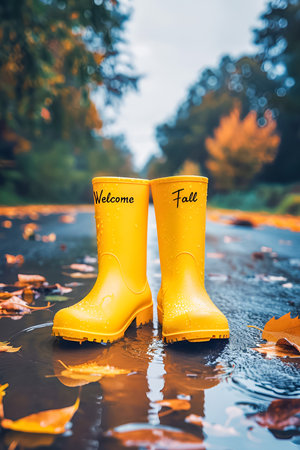 Words Welcome Fall with yellow rubber boots on a rainy day