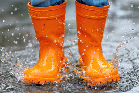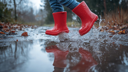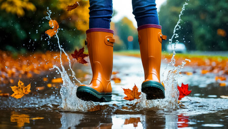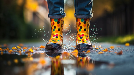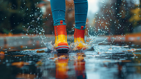A person wearing vibrant rain boots joyfully splashes through a puddle, creating ripples and splashes of water in their wake.