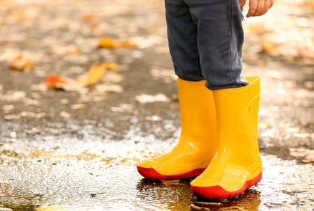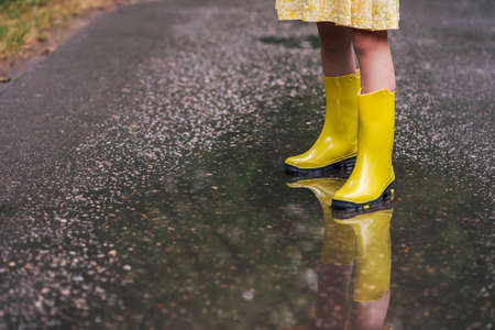 Low angle view of kids feet in a yellow color rain boots. Running in the puddle after rain, feelings of joy and happyness. Feet of child in rubber boots jumping over a puddle in the rain.