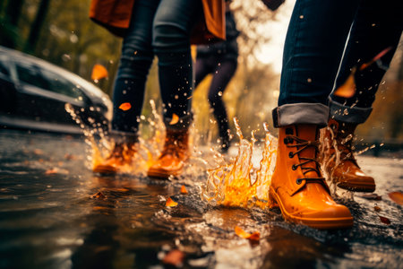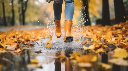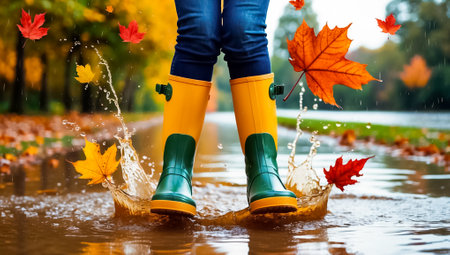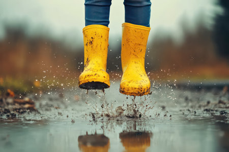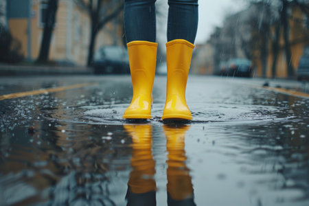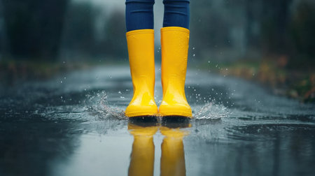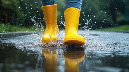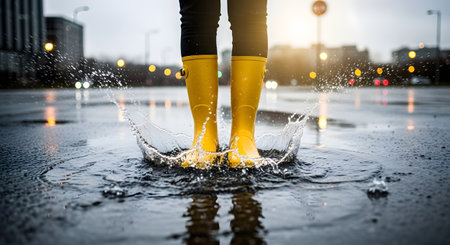 A person wearing bright yellow boots splashes joyfully in a rainy puddle, capturing the essence of fun and carefree moments in wet weather.