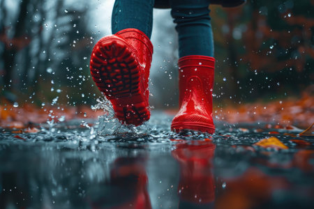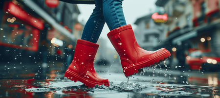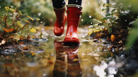 A person wearing red rain boots splashing water. Generative AI image.