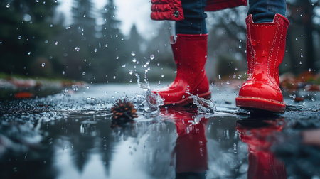 A child in bright red boots splashes joyfully in a puddle on a rainy day