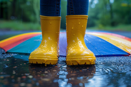 Bright yellow rain boots standing in a puddle with a colorful umbrella in the background on a rainy day. the vibrant colors and water droplets captured mid-fall create a lively and fresh atmosphere, perfect for designs related to weather, rain gear, and seasonal themes. Generative AI
