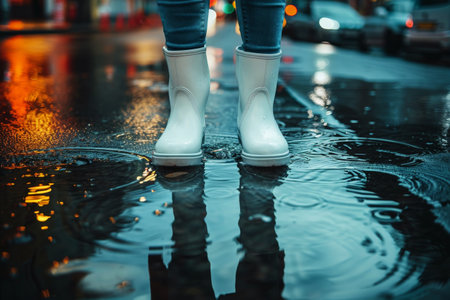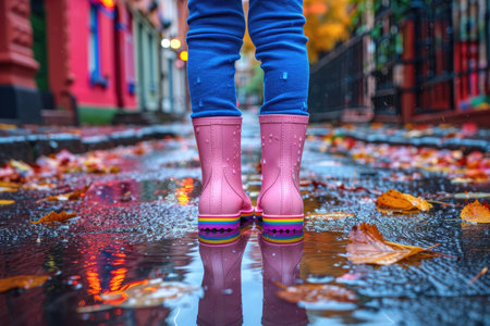 Colorful rain boots create ripples in puddles on a rainy day, showcasing playful energy and joy amidst a vibrant urban setting.