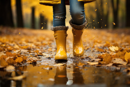 Generative AI : Feet of child in yellow rubber boots jumping over a puddle in the rain