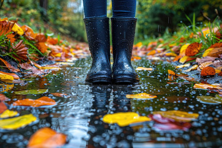 Feet in rubber boots in a puddle, autumn leaves