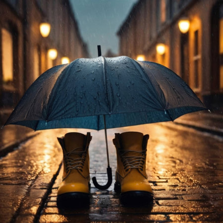 A stylish pair of boots stand on a wet surface, reflecting the hustle of a rainy urban scene. The blurred city lights and raindrops create a moody atmosphere.