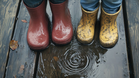 Two children wearing colorful rubber boots stand in a rain puddle, creating ripples. The scene captures the joy of outdoor play and childhood adventures in nature.