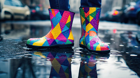 Brightly colored rain boots with a vibrant geometric design stand in a puddle on an urban street, reflecting playful colors and evoking a cheerful, artistic atmosphere.