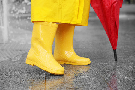 Woman with umbrella wearing raincoat and gumboots on rainy day outdoors, closeup