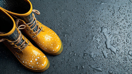 Yellow boots with rain drops on black background. Copy space for text.