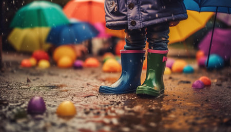 Childhood fun playing outdoors in wet autumn weather with umbrella generated by artificial intelligence