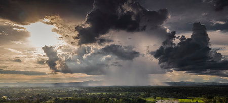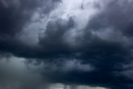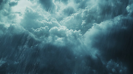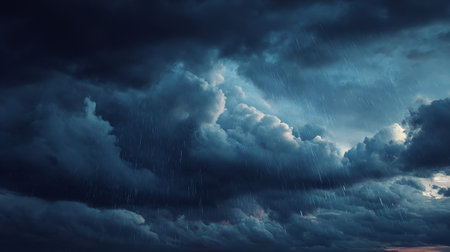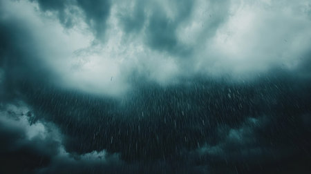 A captivating image of dark storm clouds unleashing heavy rainfall. The dramatic sky creates an eerie atmosphere, evoking feelings of instability and tension.
