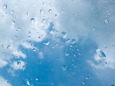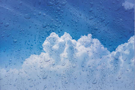 Blue sky and fluffy white clouds through the wet window on a rainy day. Stay home in daylight during social isolation. Poor weather conditions. Moisture spray and rain drops on a glass surface indoors