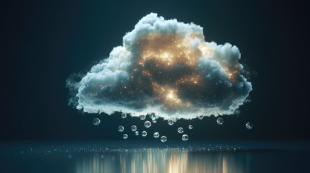 A digital illustration presents a glowing cloud icon above a reflective surface, likely water, against a dark backdrop. The scene incorporates blue and black tones, with emphasis on light and shadow. Potential applications include projects related to data storage, cloud services, and technological advancements. This style could be suitable for various commercial or editorial uses.