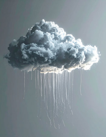 A single, stylized cloud floats in a serene, grey space, releasing a gentle downpour. This minimalist and symbolic image represents concepts of release, cleansing, sadness, or the flow of data in cloud computing. A powerful visual for themes of weather, emotion, and technology.