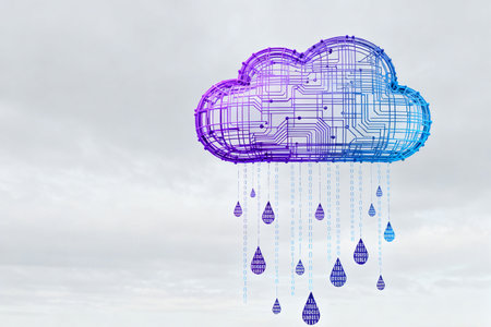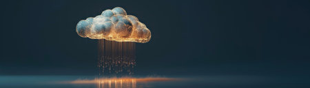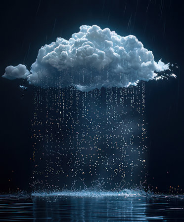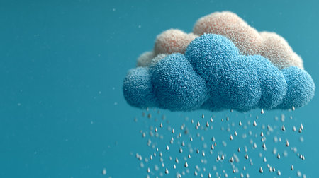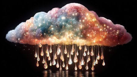 An artistic depiction showcases a cloud formation emitting luminous droplets. The image presents a blend of vibrant colors and soft textures. The digital illustration suggests a fantastical scene, potentially used for design projects, editorial content, or decorative elements.