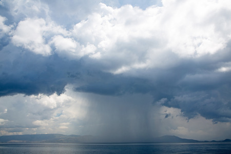 Dark, heavy storm clouds dominate the sky, with a visible downpour of rain falling over a dark sea under a bright, overcast sky.