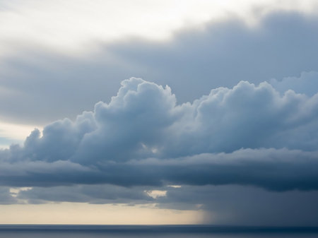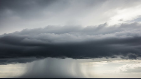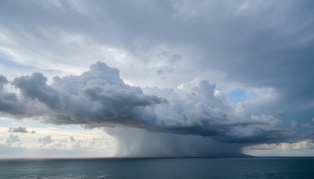 An image captures a coastal scene dominated by a vast, imposing display of dark storm clouds. Heavy rainfall descends towards the ocean surface, creating a stark contrast against the calm water. The composition highlights the raw power of nature, suitable for commercial or editorial applications.