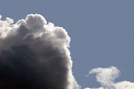 A cloud is falling rain on a blue background. The rain is falling in a steady stream, creating a sense of calm and tranquility. The blue background adds a sense of serenity to the scene