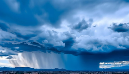 A breathtaking view of a powerful storm with heavy rain pouring over a city and mountains.