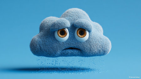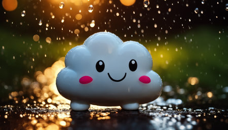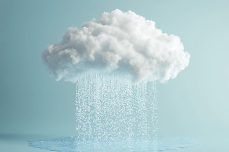 A 3D cartoon cloud raining blue water drops that create ripples on a light blue surface below.