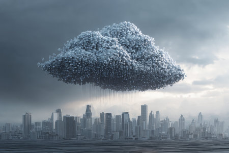 Digital cloud visualized releasing data in a futuristic rainy cityscape