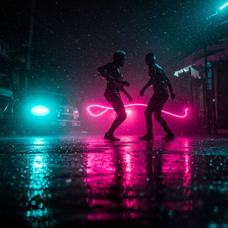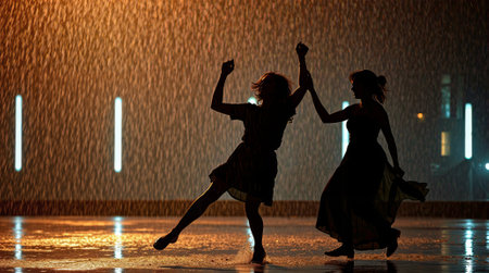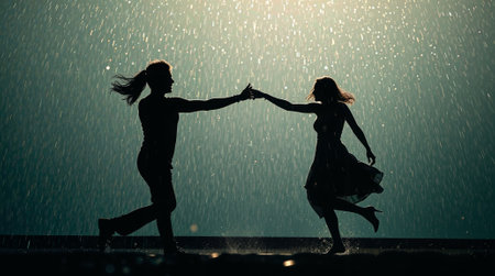 In a magical moment, a couple dances joyfully in the rain, silhouetted against shimmering puddles and glowing streetlights, embracing the beauty of the evening.