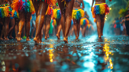 This lively image captures samba dancers in colorful attire parading joyfully under the rain on a shimmering city street, invoking a sense of jubilation and cultural celebration.