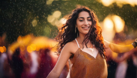 Attractive woman dancing in the summer rain and enjoying the drops of water Generative AI