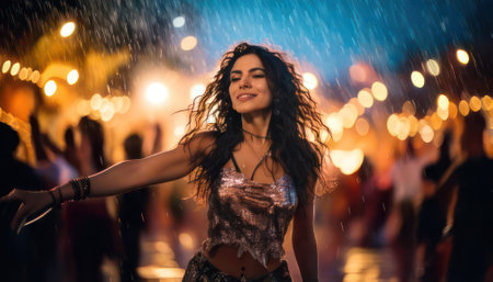 Beautiful young woman dancing in the rain with blurred lights in the background