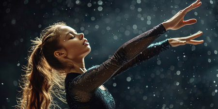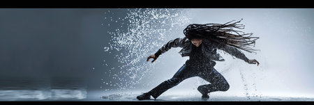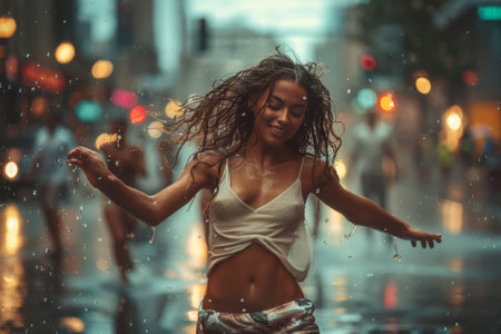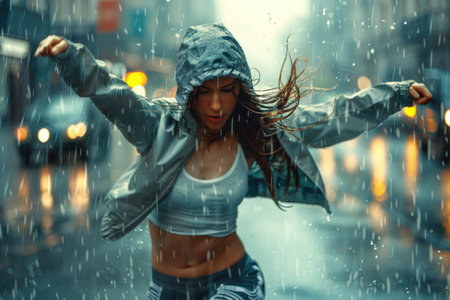 woman dancing hip hop in rain, sportive movements. ai generatedCLOSE UP, LENS FLARE: Joyful blonde girl enjoys her evening in the countryside by dancing in the rain. Stunning golden sun rays shine on playful young woman spinning and enjoying a spring shower.