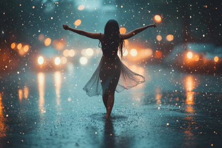 A woman dances in the rain, illuminated by soft street lights, creating a magical nighttime atmosphere.