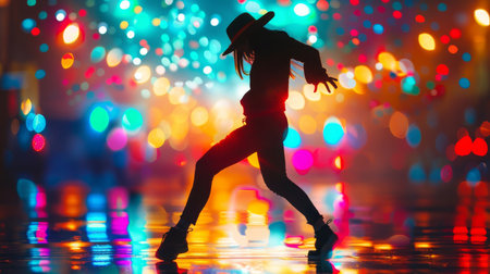 A dancer strikes a pose on a rain-soaked street, illuminated by the multicolored bokeh of a vibrant city night.