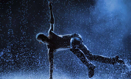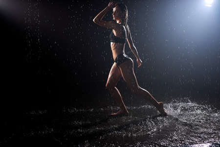 Young beautiful dancer is dancing in the rain on a dark background.