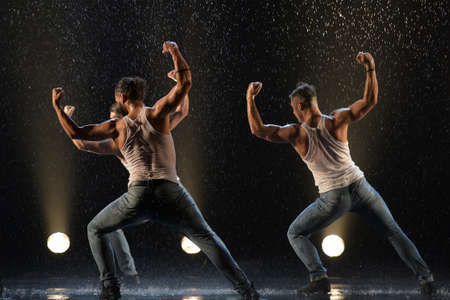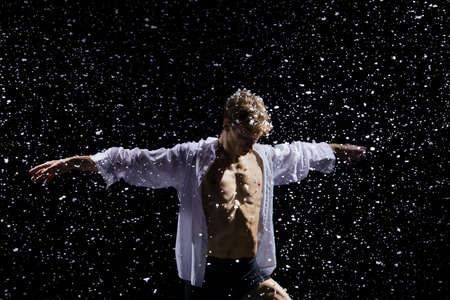 A young barefoot man wearing wet blue jeans and a white shirt expressively dances modern dances on the water under rainy waterdrops among the watersplashes. Isolated on a black background. Copy space.