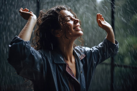 Beautiful young woman dancing in the rain on a rainy day.