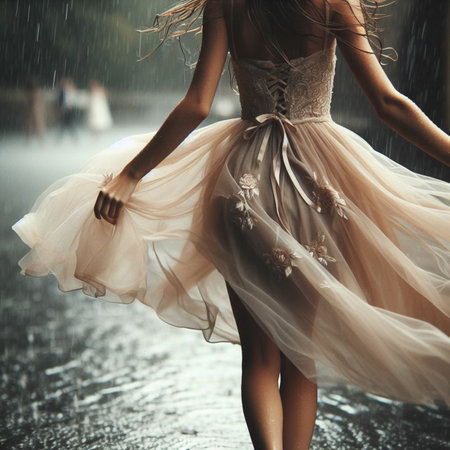 A dancer spins joyfully in a flowing white dress, surrounded by falling rain and a misty atmosphere at dusk.