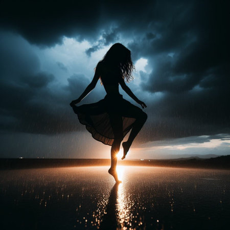 Silhouette of a beautiful girl dancing in the rain at sunset