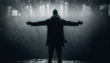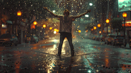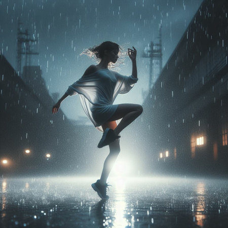 Street artist performing a dance under the rain in a city at night, enjoying the rhythm of falling drops