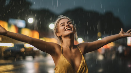 Happy smiling woman dancing under rain in the street. Emotions concept. Generative AI