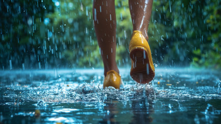 A close-up view of bare feet joyfully splashing in rainwater, creating dynamic droplets amidst a vibrant outdoor scene, capturing the essence of playful happiness in nature.