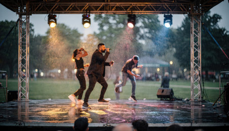 Medium shot capturing performers on stage under a temporary truss structure amid light rain raindrops softly blurring the outoffocus park background.