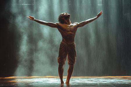 A male dancer showcases his talent and strength on stage, illuminated by dramatic beams of light. The atmosphere exudes intensity and emotion as he captures the audience's attention with his powerful movements in a theater setting.
