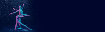 Grace, beauty, tenderness. Two young women. professional ballet dancer performing under water drops over dark blue background in neon light.