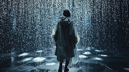 Rain room silhouette of a person dancing in the rain in black and white.