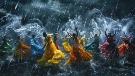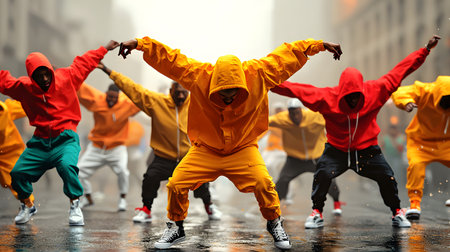 A vibrant group of dancers in colorful outfits perform in the rain-soaked street, exuding energy and passion. The foggy urban backdrop adds a mysterious, captivating atmosphere to their performance.