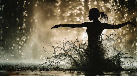 Silhouette of a graceful dancer surrounded by a dramatic splash of water, backlit by shimmering light.
