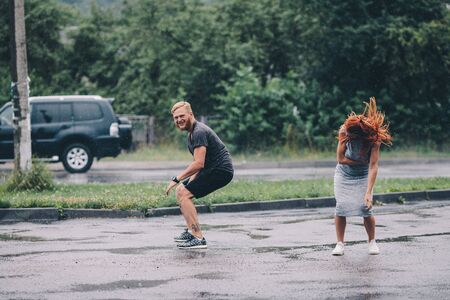 beautiful couple jumping on the road in the rain