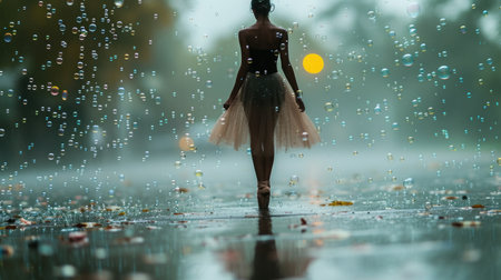 back view of ballerina dancing on a damp surface while rain falls